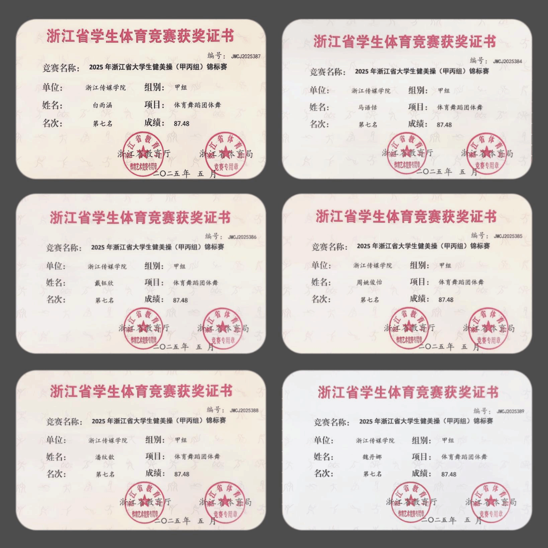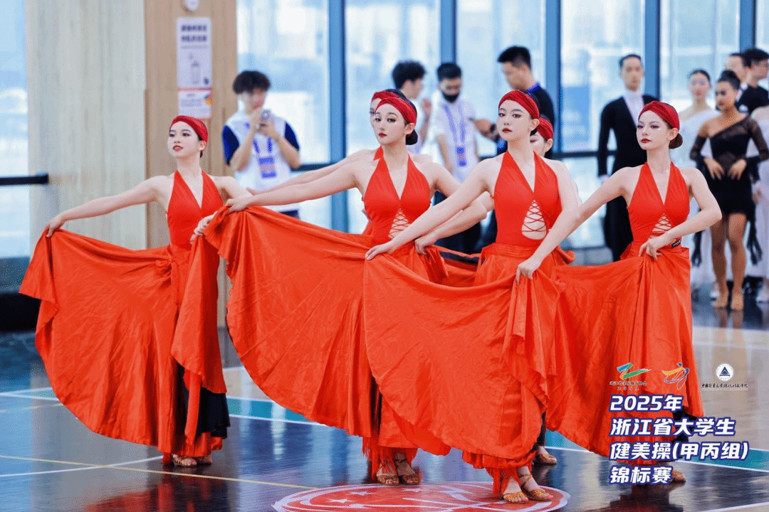 2025525日,浙江省大学生健美操(甲丙组)锦标赛在中国计量大学现代科技学院圆满落幕。啪啪啦 体育舞蹈队六名队员在啪啪啦 胡军琅老师的带领下参加比赛,以为主题,在舞台上尽情释放拉丁魅力,一路过关斩将,最终获得了第七名的好成绩。