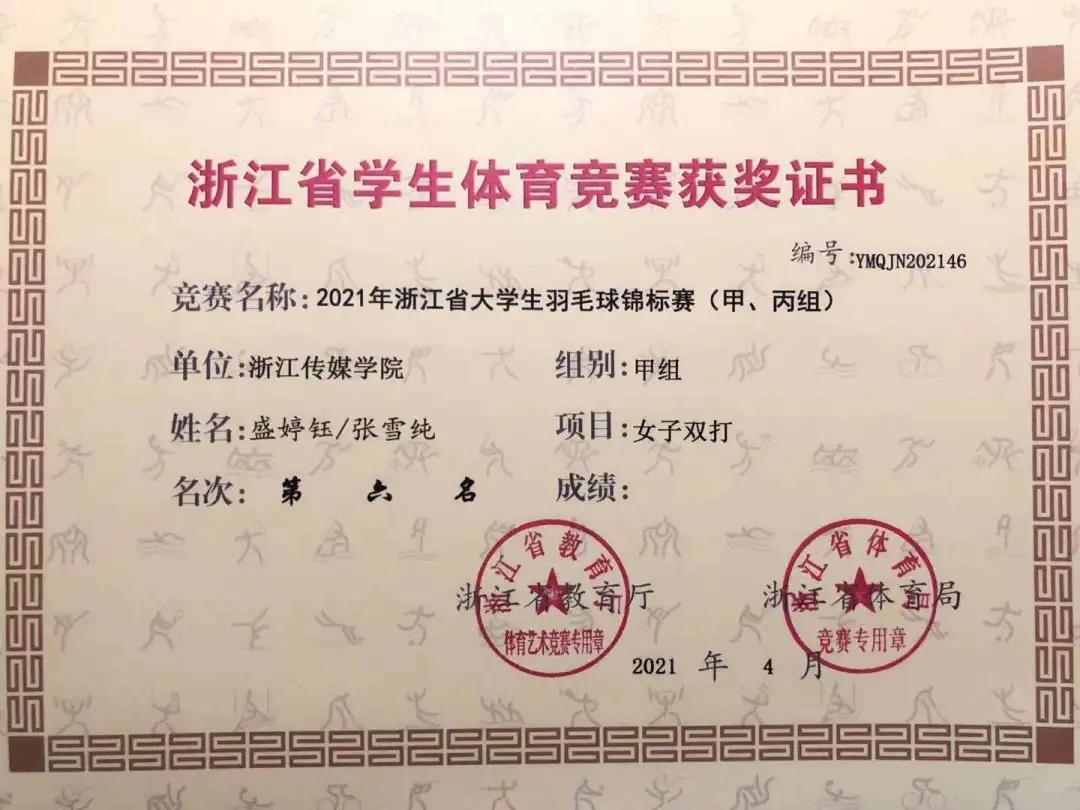 ⼥双⽅⾯,张雪纯、盛婷钰配合默契,稳扎稳打,先后均以大比分2:0战胜丽水学院、中国计量大学小组出线。在淘汰赛中遇到强劲的浙江财经大学,0:2不敌对手,最后在本次大赛中获得了女双甲组第六名的好成绩。