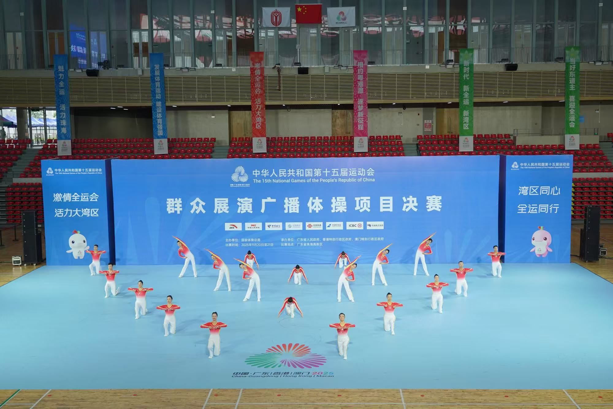 近日,在广东珠海举行的中华人民共和国第十五届运动会群众展演广播体操项目决赛中,啪啪啦